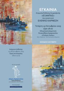 Στον φιλόξενο χώρο της Ολυμπιακής Δημοτικής Πινακοθήκης «ΣΠΥΡΟΣ ΛΟΥΗΣ», υπό την αιγίδα του Δήμου Αμαρουσίου, η σύγχρονη και αξιόλογη εικαστικός, Ελένη Καρνέζη, δίνει το δικό της στίγμα στην Τέχνη, παρουσιάζονταςτην ατομική έκθεση ζωγραφικής με τίτλο ΕΞΑΝΤΑΣ.