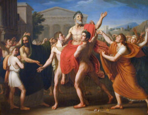Τότε ο Διαγόρας εν μέσω επευφημιών και πλήρης ευδαιμονίας άφησε την τελευταία του πνοή μέσα στο αρχαίο στάδιο της Ολυμπίας στα χέρια των γιών του…