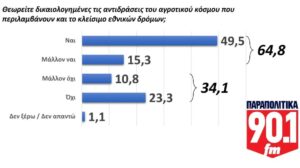 Στο κορυφαίο λοιπόν ζήτημα των τελευταίων ημερών, αυτό των αγροτικών κινητοποιήσεων, ένα πολύ σημαντικό ποσοστό της τάξης του 85,1% θεωρεί δίκαια τα αιτήματα του αγροτικού κόσμου. Ενώ το 64,8%  δικαιολογεί τη μορφή των κινητοποιήσεων, που περιλαμβάνουν και το κλείσιμο των εθνικών οδών. Σε αυτή τη φάση, οι αγροτικές διεκδικήσεις φαίνεται να έχουν την ανοχή της υπόλοιπης ελληνικής κοινωνίας, που σε συνδυασμό με όλα όσα αποκαλύπτονται γύρω από το σκάνδαλο του ΟΠΕΚΕΠΕ αναγνωρίζει το δίκιο των κινητοποιήσεων και τοποθετείται φιλικά απέναντι στα αιτήματα του αγροτικού κόσμου. Τα καμπανάκια για την κυβέρνηση Μητσοτάκη γίνονται πλέον θεόρατες καμπάνες.