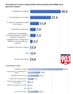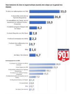 Στην εγχώρια πολιτική σκηνή, η υπόθεση του ΟΠΕΚΕΠΕ με 40,6% αποτυπώνεται ως το σημαντικότερο πολιτικό γεγονός του 2025, ακολουθούμενο από τις πανελλαδικές συγκεντρώσεις των Τεμπών με 27,6%. Τις ενεργειακές συμφωνίες που υπέγραψε η χώρα αναγνωρίζει ως το σημαντικότερο γεγονός το 11,8% του συνόλου και ακολουθούν τα τρέχοντα θέματα των αγροτικών κινητοποιήσεων με 7,4% και η πρόσφατη εκλογή του Έλληνα υπουργού Οικονομικών, Κυριάκο Πιερρακάκη, στη θέση του προέδρου του Eurogroup με 7,3%.