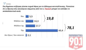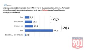 Στην ίδια δημοσκόπηση τέθηκε και το ερώτημα αν η ίδρυση κόμματος Τσίπραθα μπορούσε να καλύψει το αντιπολιτευτικό κενό με το 74,1% να απαντά όχι και μάλλον όχι και το 23,9% ναι ή μάλλον ναι. Στο ίδιο ερώτημα για τυχόν κόμμα Σαμαρά το ποσοστό του όχι/μάλλον όχι είναι στο 78,1% και του ναι/μάλλον ναι στο 19,8%.
