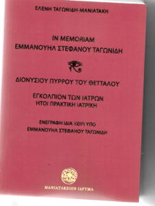 Και στην εκδήλωση αυτή, που πραγματοποιήθηκε σε μια κατάμεστη αίθουσα, παρουσιάστηκε το βιβλίο «In Memoriam Εμμανουήλ Στεφάνου Ταγωνίδη-Διονυσίου Πύρρου του Θετταλού Εγκόλπιον των Ιατρών ήτοι Πρακτική Ιατρική».