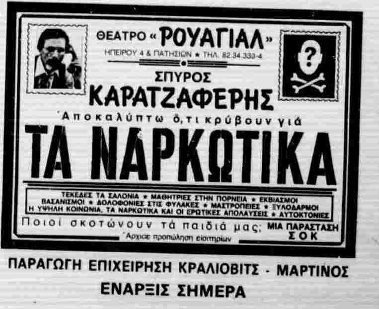 Βρισκόμαστε στα 1983 και βλέπουμε ότι ο Σπύρος Καρατζαφέρης επιφανής και κορυφαίος ρεπόρτερ της εποχής, αδελφός του μετέπειτα προέδρου του ΛΑ.Ο.Σ., βρίσκει έναν ευφάνταστο, αλλά θα έλεγε κάποιος και ακριβό όχι μόνο για τότε αλλά και για κάθε εποχή τρόπο να επικοινωνήσει με το κοινό. ‘’Κλείνει’’ το – γκρεμισμένο πια σήμερα –θέατρο Ροαγιάλ, επί της οδού Ηπείρου που διαχειρίζονταν τότε οι επιχειρηματίες Κραλιοβιτς και Θάνος Μαρτίνος – ο παλιός, γνωστός σε πολλούς ηθοποιός – για να μιλήσει για το πώς διακινούνται και τι δεινά προκαλούν τα ναρκωτικά.