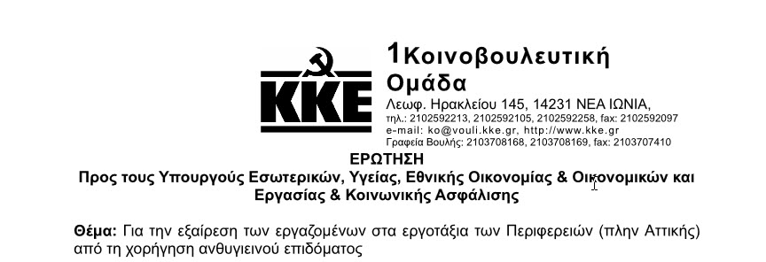 ΚΚΕ ΕΡΩΤΗΣΗ-ΓΙΑ ΤΗΝ ΕΞΑΙΡΕΣΗ ΤΩΝ ΕΡΓΑΖΟΜΕΝΩΝ ΣΤΑ ΕΡΓΟΤΑΞΙΑ ΤΩΝ ΠΕΡΙΦΕΡΕΙΩΝ (ΠΛΗΝ ΑΤΤΙΚΗΣ) ΓΙΑ ΑΝΘΥΓΙΕΙΝΟ ΕΠΙΔΟΜΑ