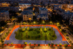 Παράλληλα, δημιουργήθηκε νέο κλειστό γήπεδο μπάσκετ με τη χρήση αεροϋποστηριζόμενου θόλου – μια καινοτόμα και οικονομική λύση διεθνών προδιαγραφών – καθώς και υπαίθριοι χώροι άθλησης με σύγχρονα όργανα, φωτισμό LED, καθιστικά, αστικό εξοπλισμό και πλούσια φύτευση. Όλες αυτές οι παρεμβάσεις αναβαθμίζουν την ποιότητα ζωής των κατοίκων και ενισχύουν τη συμμετοχή στον αθλητισμό.