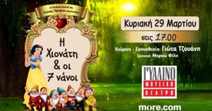 Η πιο αστεία, τρυφερή και διαδραστική Χιονάτη που έγινε ποτέ , έρχεται στο Γυάλινο Μουσικό Θέατρο και υπόσχεται να μαγέψει μικρούς και μεγάλους! Η σκηνοθέτης Γιώτα Τζουάνη με την χαρακτηριστική θεατρική ματιά της , δημιουργεί μια παράσταση, μια σύγχρονη και γεμάτη χρώμα διασκευή του κλασσικού παραμυθιού που δεν πρέπει να χάσει κανείς! “ Η Χιονάτη και οι 7 Νάνοι“ είναι ένας σύγχρονος , κεφάτος και γεμάτος φαντασία θησαυρός για όλη την οικογένεια !